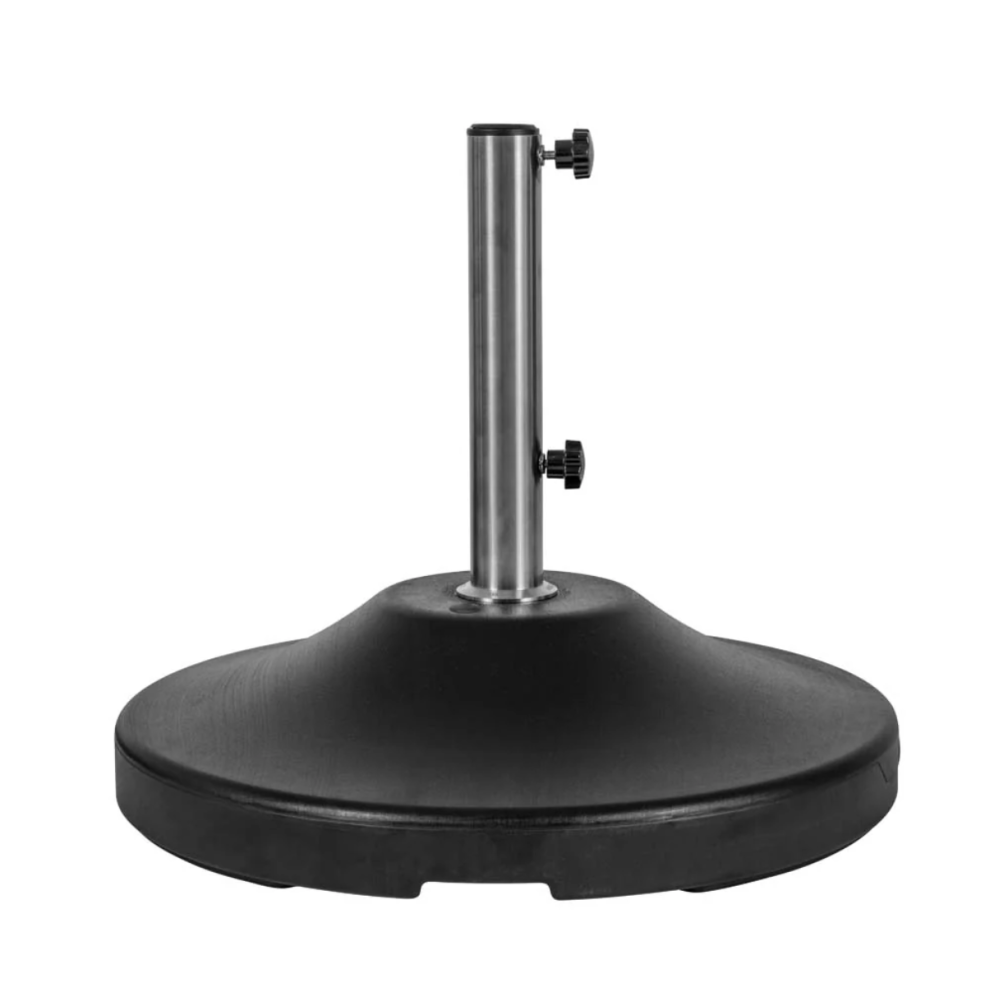 The 120-lb. Resin Plastic-Encased Concrete Umbrella Base is crafted with a high-density polyethylene shell with UV protection that will not rust, dent, or fade, and can withstand the elements in any weather climate. The base is pre-filled with concrete.The base comes with a stainless steel stem that fits an umbrella from 1.5 to 2 inch diameter. The base has a finger grip lift on one end and a roller on the opposite end to pull the base. Available in bronze, white, grey or black. Designed for: freestanding use, commercial or residential use. Assembly required.